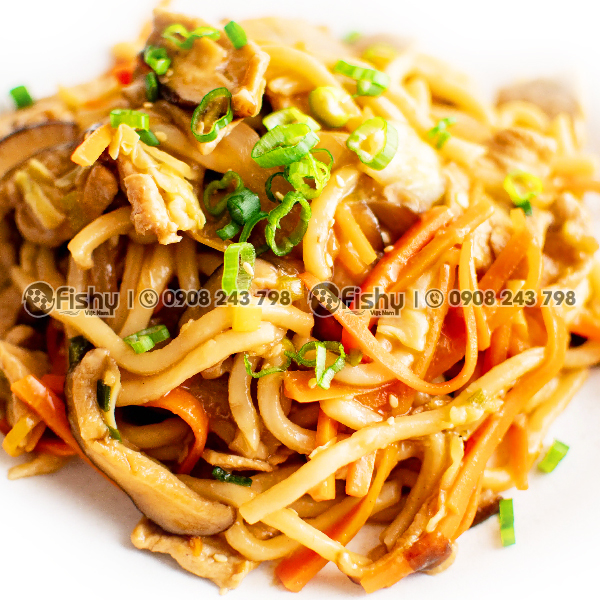 - Instructions: Steam udon noodles to soften. In a large skillet, roast the thinly sliced pork or chicken with oil. Add the vegetables and mushrooms to the pan and saute until cooked. Then, add the udon noodles to the pan and mix well with the seasonings like soy sauce, MSG, sugar and pepper. Stir-fry until the udon noodles are cooked and fragrant. Enjoy hot.